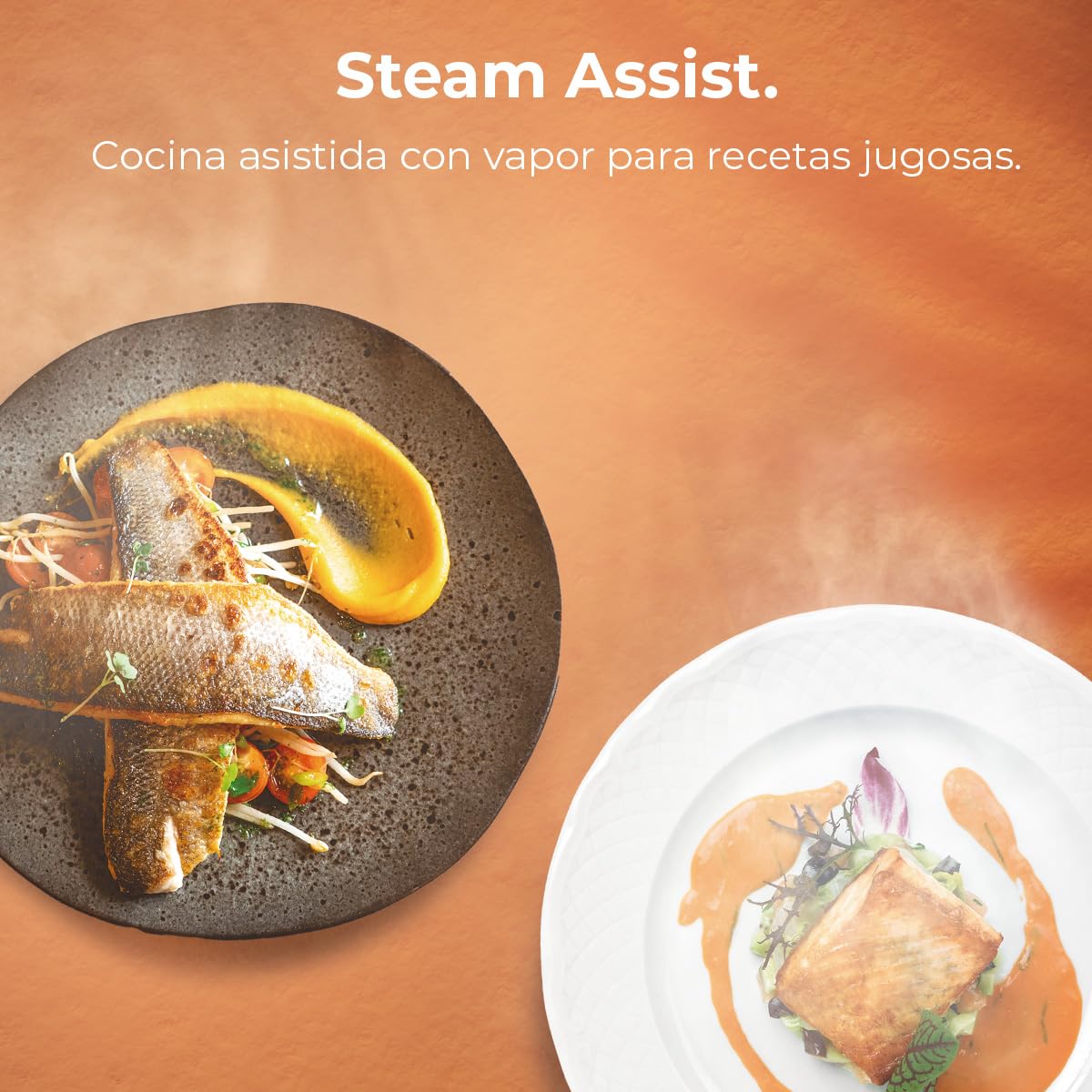 - Steam Base XXL: zona Steam XXL de hasta 0,8L para el uso de las funciones Steam EasyClean y Steam Assist. Steam Assist: prepara tus platos con esta función, utilizando el horneado junto con el vapor para que tus recetas queden crujientes por fuera y jugosas por dentro. Steam EasyClean: el vapor desincrusta la suciedad y permite una mejor limpieza.